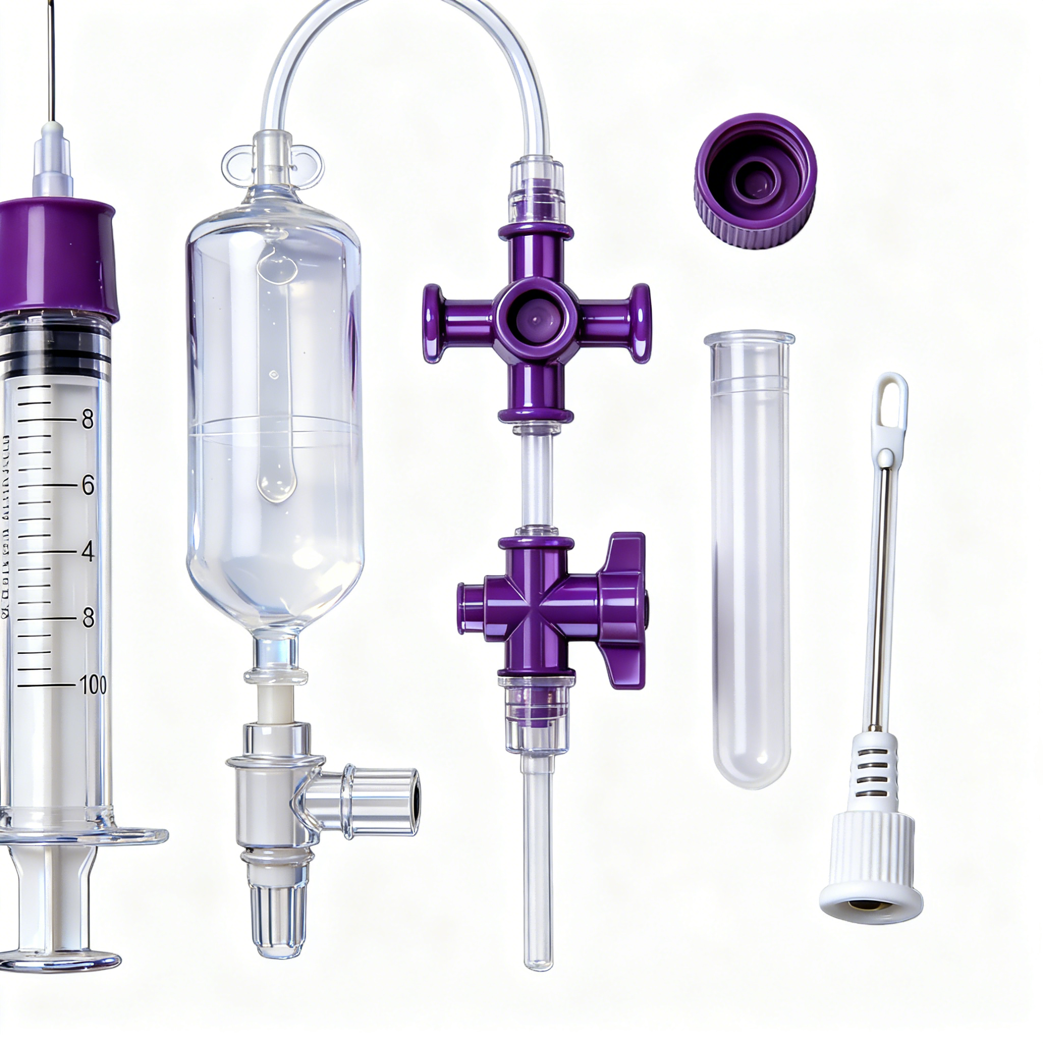 Tıbbi Sınıf Sıvı Dağıtım Bileşenleri – Klinik Sıvı Yönetimi için USP Sınıf VI Uyumluluğuna sahip Yüksek Hassasiyetli Şırıngalar, Damlama Odaları ve 3 Yollu Musluklar